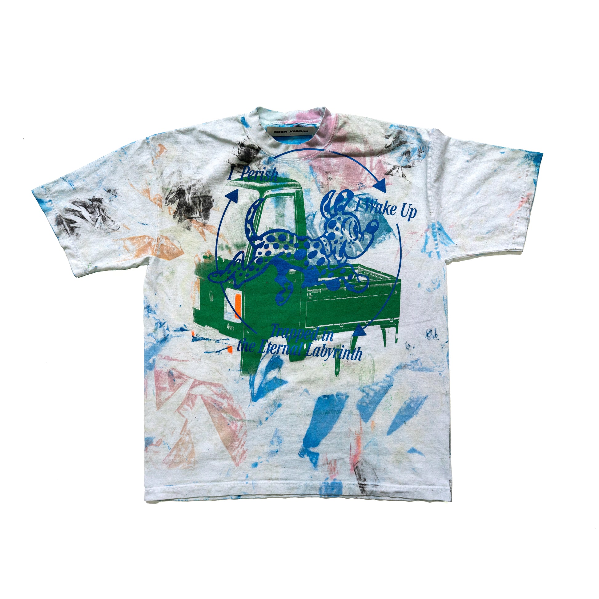 Each test print shop rag shirt is a unique product of several months of screen printing. During a normal print run, screens need to be cleaned, prints need to be aligned, and mistakes are made. These shirts are the result.